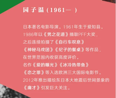 日本鬼才导演园子温一直以叛逆、打破常规的姿态备受国际影坛关注。其早年以《男之花道》摘取日本影坛登龙门的PFF大奖,之后连续拍摄了《自行车叹息》《纪子的餐桌》等个性作品。
